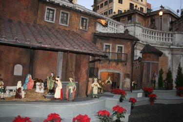 Otro Naciemiento que llamó nuestra atención es el de la bulliciosa Plaza de España, muy costumbrista, muy italiano, que incluía hasta una heladería al lado del establo. Este también representa todo el misterio, con el Niño Jesús incluido. En la fotografía de la derecha, el Nacimiento de la Plaza que lleva el nombre de nuestro país , adornado con abundantes flores de Pascua, un lugar en el que la gente joven queda con sus amigos, un punto de encuentro, muy bullicioso y lleno de vida.