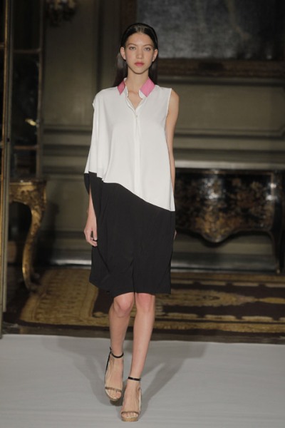 Y el último modelo, con detalle de color rosa en el cuello camisero, de un bicolor blanco y negro. Otra apuesta para esta primavera/verano de la diseñadora.