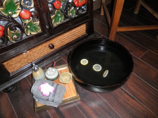 | Primero un confortable lavado de pies. |