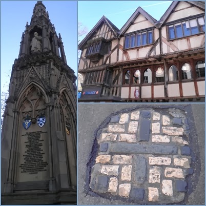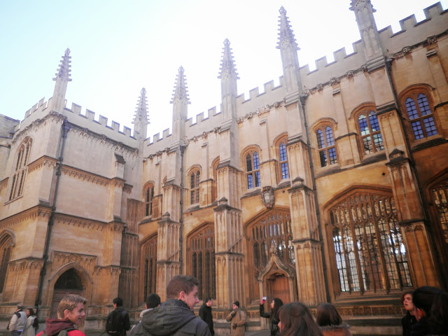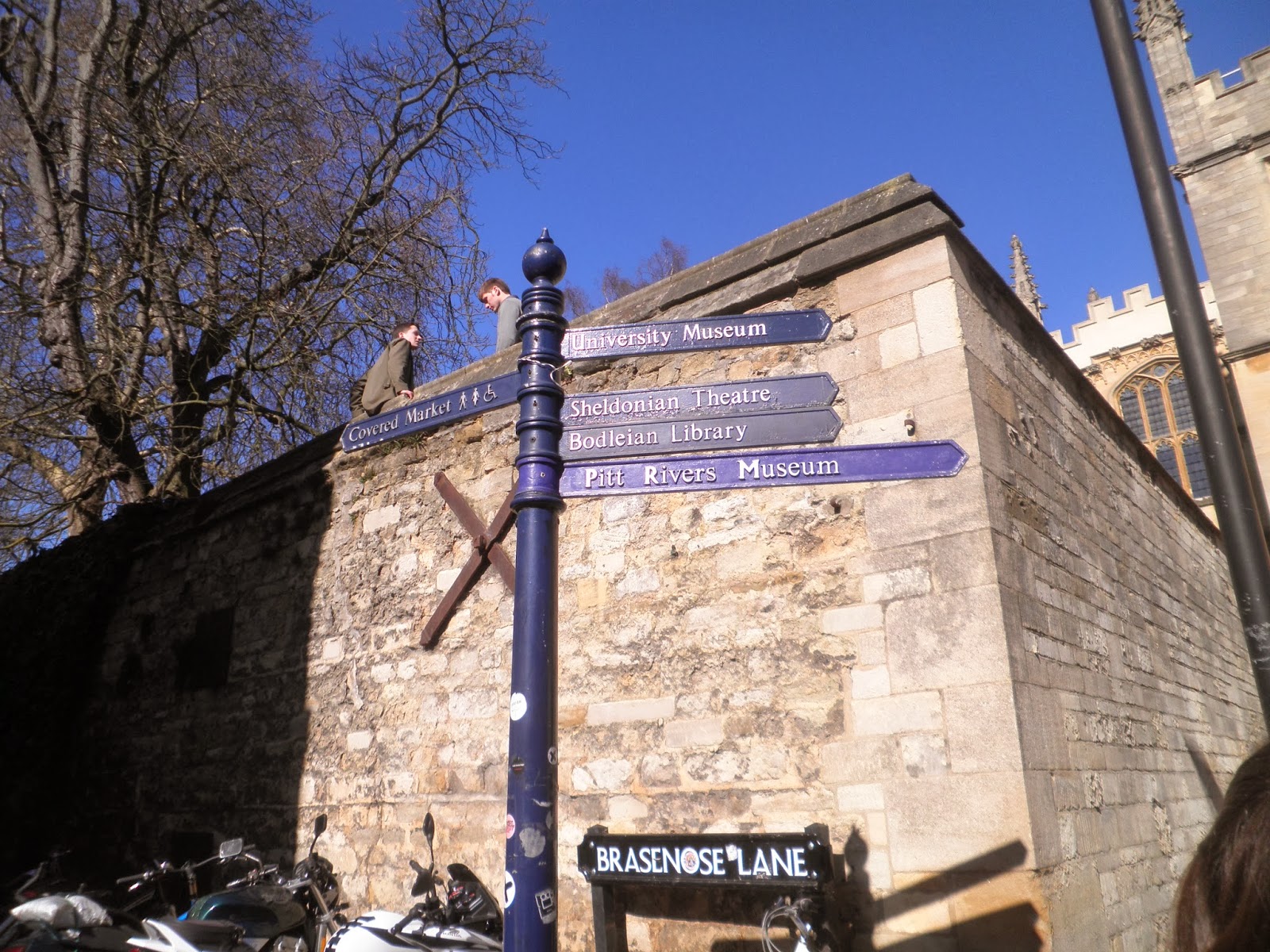 Mi primer día en la ciudad fue también un shock. La primera actividad planteada para mi viaje consistía básicamente en un tour a pie y con un correctísimo guía inglés, por el centro de la ciudad. Pero antes pudimos dar un paseo por Cornmarket Street, que está llena de tiendas, y tuvimos la oportunidad de tomar algunas fotos. La tercera foto del collage, puede parecer un tanto extraña, pero en realidad es muy interesante. Se trata del lugar en el que se cree que Bloody Mary sentenció a los ahora santos religiosos por no compartir sus ideas, lugar que ha sido conservado tal y como estaba por aquel entonces, quedando así, como una especie de cruz en medio de la calle.