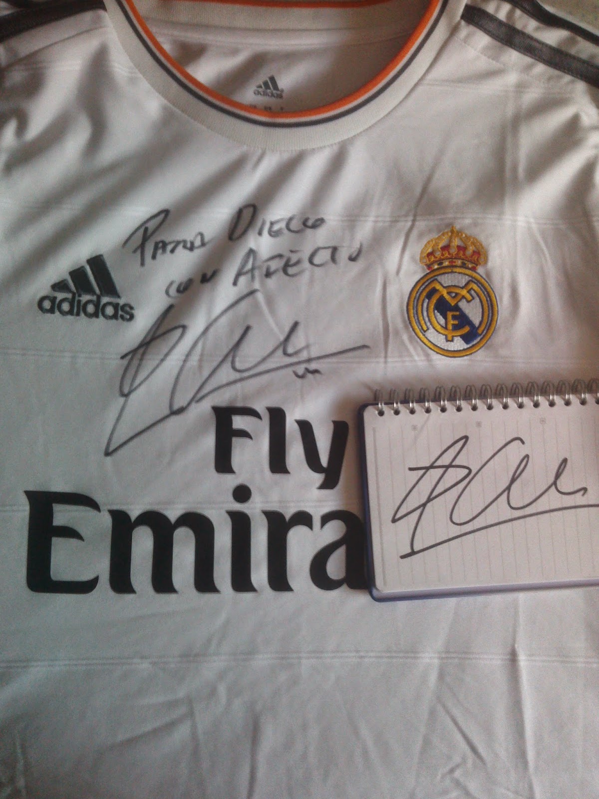 Como madre de madridista hay algo que en ese momento he aprovechado para decirle yo a Xabi Alonso, micrófono en mano: ´Xabi yo he traido en el bolso «parte del corazón de mi hijo» en forma de camiseta del Real Madrid, para que me la firmes. No puedo volver a casa sin conseguirlo`, y por supuesto Xabi me ha dicho que al finalizar el turno de preguntas lo haría. Y ha cumplido lo prometido, porque él mismo ha preguntado por la camiseta antes de subir por las escaleras de la Casa de América, y ha firmado y dedicado la camiseta a mi hijo Diego con afecto y hasta ha puesto su rúbrica en un cuderno de autógrafos del Real Madrid, que mi hijo -previsor él- también me había metido en el bolso «por si quiere firmármelo».