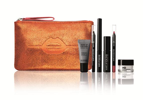 MAKE UP FOR EVER recoge en una bolsa de color naranja brillante, 6 productos de culto para que todas las mujeres puedan crear un look de belleza completo de uso diario. Para un look atractivo, nos encontramos con un Aqua Liner, un Aqua Eyes en tono aguamarina tamaño para llevar, y un mini rímel Smoky Extravagant. También un Step 1 Skin Equalizer y una versión mini de HD Powder que fija y sublima la tez. Por último, el Aqua Lip 08C viste tus labios con un rojo mate muy profundo.