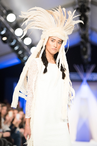 Como broche final del desfile, un vestido de novia Sioux que camina descalza por la nieve con un vestido calado y rematado con flecos.