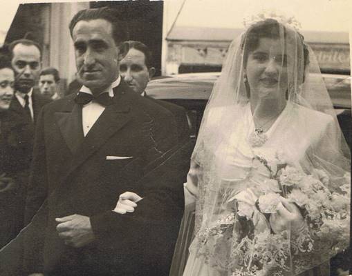 Isabel García Lucio, mi madre, lleva un precioso velo, sujeto en una corona de flores. El vestido tiene el escote en V, con pliegues delanteros en el pecho y la falda es de capa. El ramo de flores en cascada, a mi me ha recordado el que lució lady Di en su boda con el príncipe Carlos de Inglaterra. En los ramos en cascada las flores caen hacia abajo imitando la forma de una cascada, para dar sensación de verticalidad. Es el ramo perfecto para novias altas, como en este caso. Suele ir asociado a novias clásicas, que eligen larga cola y velo. El ramo toma un gran protagonismo. En este caso es un ramo espectacular… y no demasiado visto en aquella época.