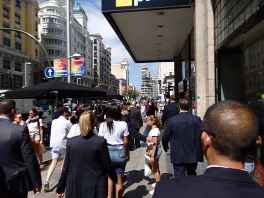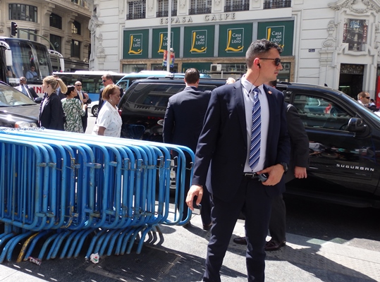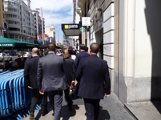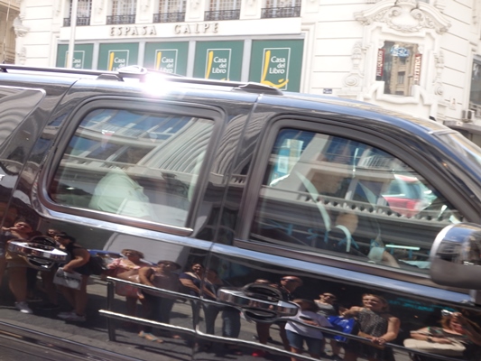 Un numeroso grupo de viandantes se quedaron esperando a que salieran, pasó alrededor de 1 hora… y nada. La espera se hizo un poco interminable y cuanta más gente pasaba más se quedaban a verlas salir. En cierto momento alguién empezó a comentar que en la esquina de enfrente estaba la presidenta de la Junta de Andalucía, Susana Díaz (con quién he coincidido en numerosas ocasiones en FITUR por cierto)… es lo que tiene la Gran Vía Madrileña, no puede ser más cosmopolita.  Por fin vimos que las hijas de Obama iban a salir, prepararon un enorme coche de la embajada americana en Madrid… y se palpaba en el ambiente que Sasha, Malia y su abuela Marian no podían tardar mucho en aparecer de nuevo.