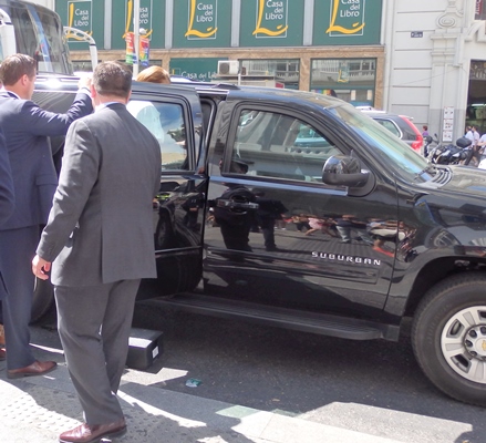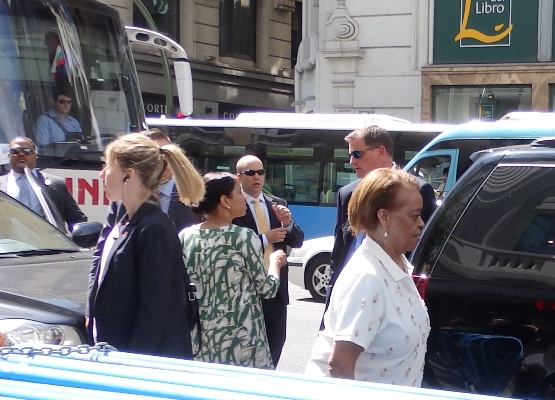 Las asistentes se pusieron por delante de las chicas, los guardaespaldas también… y se dirigieron todos hasta el enorme coche americano. Las chicas subieron al alto coche sin problema y para la abuela y acompañante los de seguridad pusieron un peldaño de madera para que accediesen con mayor comodidad, Marian Robinson tiene 79 años. Y ¡zas! tal como llegaron se perdieron entre el tráfico de la Gran Vía Madrileña. La comitiva en otro coche… detrás.