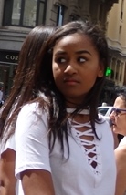 Sasha Obama de compras por la Gran Vía madrileña, el pasado día 30 de junio de 2016, detrás de ella, con vestido blanco su hermana Malia. Su madre esa misma mañana tenía diversos actos culturales en compañía de la reina Letizia.