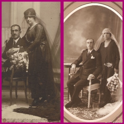 A la izquierda en la fotografía, la foto de boda de mi abuela Lola, con mi abuelo Ginés, maestro. En la fotografía de la derecha, Francisca Diez Barredo y Constantino García González, abuelos de mi amiga Esperanza García Carmena. La novia con un espectacular velo en blanco.