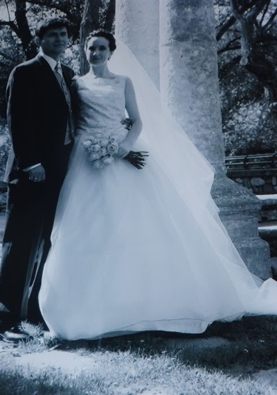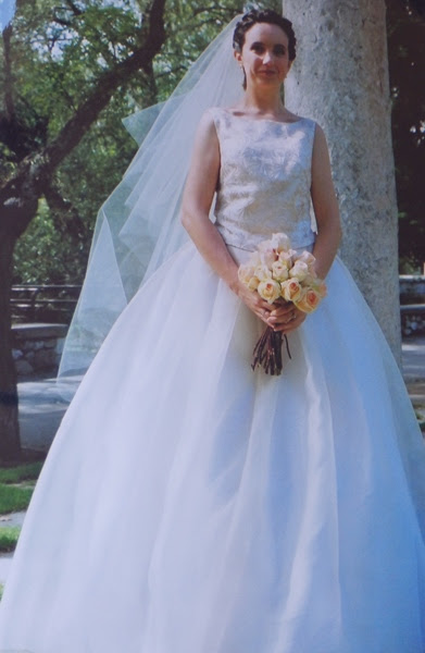 El vestido de Ana era precioso y de lo más exclusivo… diseñado por la propia novia y realizado por la madre de la novia, Begoña D., prestigiosa modista burgalesa. Era el segundo vestido de novia que hacía Begoña, el primero fue el de su otra hija Rosa. Un vestido con cuerpo en color champán, de encaje con forro y falda con 3 capas de tul. Muy vaposoro, con mucho movimiento… en una palabra: precioso.