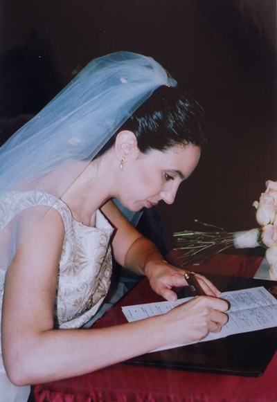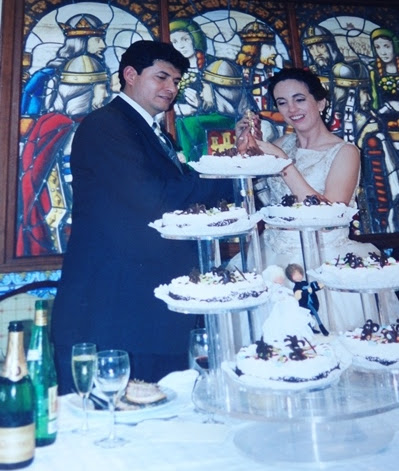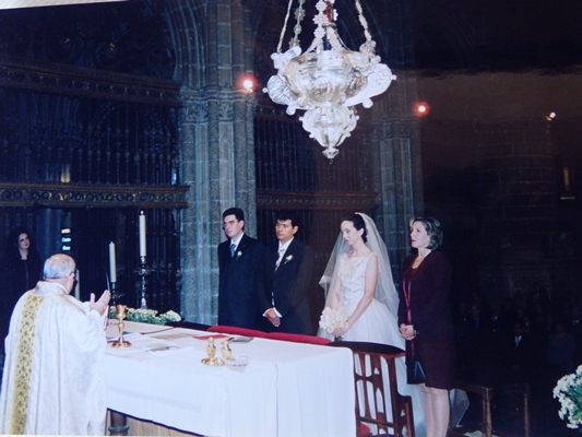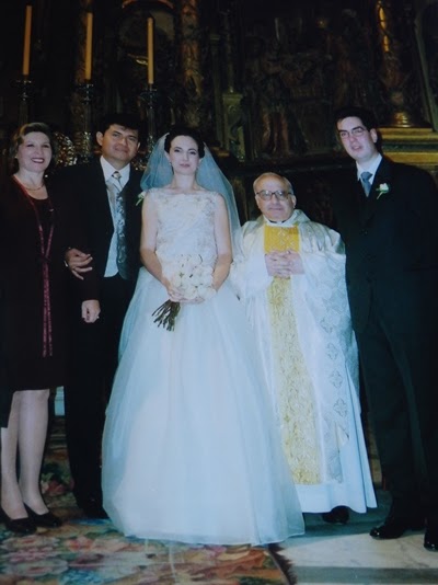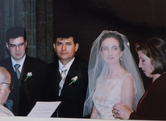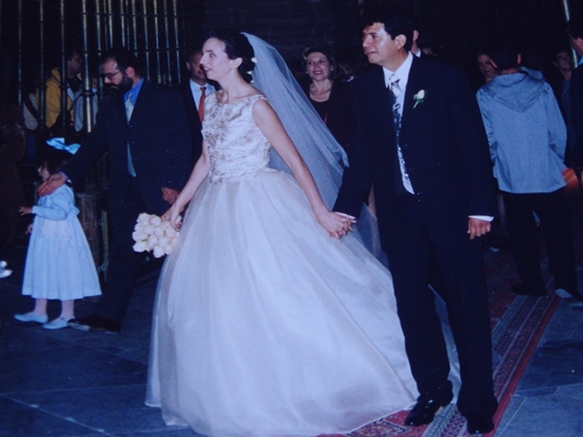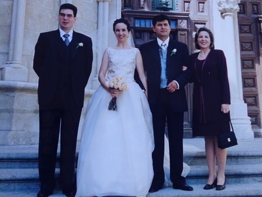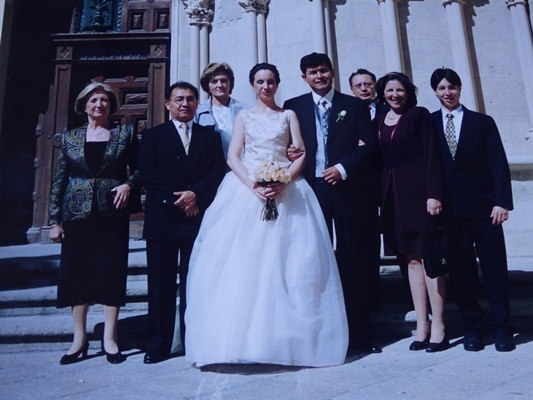 El novio, Carlos A. M. R, llegó a España en 1984, para continuar los estudios de 3º de Medicina, carrera que había comenzado en su país, Perú. El y mi marido, Manuel Zamora Gómez, son magníficos amigos desde entonces (mis hijos dirían mejores amigos, y yo diría amigos del alma, más que familia, como un hermano), se conocieron cursando tercero de Medicina en el hospital de la Cruz Roja. El padre de Carlos solo quería que terminase la carrera en España, porque en Perú había muchas huelgas de estudiantes. Y que al terminarla se volviera a su país. Por eso el primer año de estar en España le compró un Ford Escort y no quiso comprarle un piso en Madrid, en aquella época un piso y un buen coche costaban prácticamente lo mismo. Carlos es natural de Tacna, al sur de Perú, la última ciudad antes de Chile. Y practicamente vuelve a su país a ver a sus padres una vez o dos veces al año.