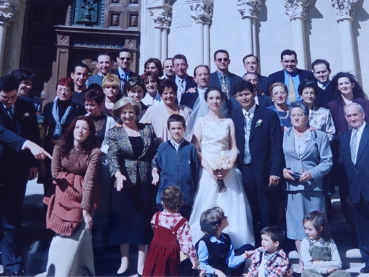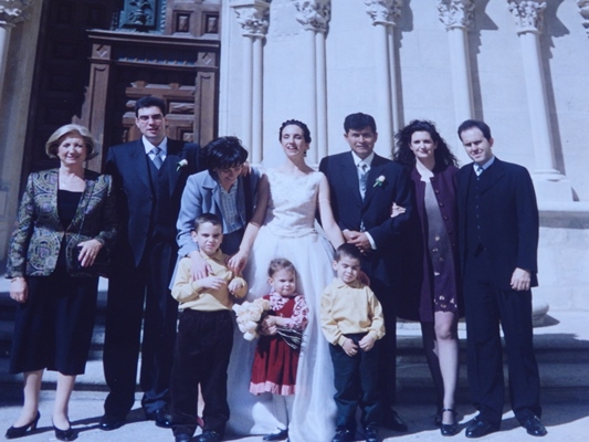 | Los novios posan con parte de la familia de la novia, su hermano y hermana y los respectivos cuñados. A la izquierda su madre, delante tres de los sobrinos. |