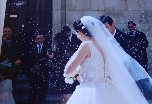 | A la izquierda de los novios, junto a su padre, mi hijo pequeño, intentando comprender qué ocurre para que caiga tanto arroz. Los novios se sonríen, con la descendencia más que asegurada. |