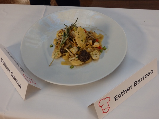 Esther Barroso y Esther García han cocinado «La tierra y la pasta», un plato de pasta al que han querido darle el sabor de la tierra a través de un micropisto de verduras, alcachofas y setas, un producto en plena temporada. Han potenciado el sabor de la tierra a través de romero quemado con el soplete y el café, que han incorporado a la cocción de la pasta. Finalmente han jugado con las texturas, aportando varios crujientes al plato.