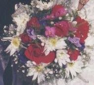 Antes hablábamos del ramo de la novia, de las margaritas blancas, de las rosas, de las florecillas, los colores blanco, rojo, violeta, verde… Emi lleva un semirecogido, con tocado de florecillas blancas y cabello suelto en cascada. El vestido es de manga larga, mangas de farol. Con cuerpo cruzado. Luce pendientes y collar de perlas.