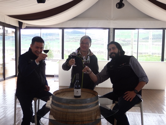 | El presentador del programa/productor en el centro, Guillermo Penso, propietario de la bodega, a la derecha. |