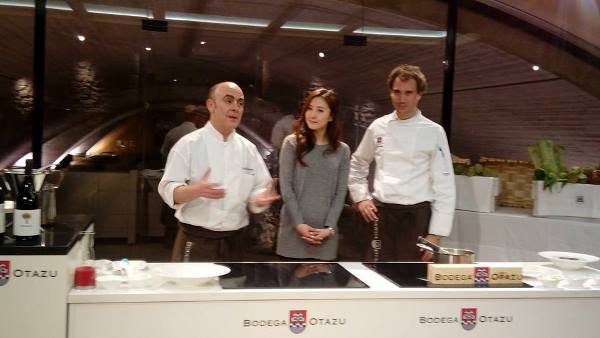 Tras el paso por Le Clerc Pamplona (al equipo chino le encantaron el jamón, los espárragos, el aceite de oliva y los vinos de la bodega Otazu), y un breve descanso en nuestro hotel (Alma Muga de Beloso), regresamos a la bodega, donde disfrutamos de un rico aperitivo en la carpa, elaborado por el cocinero navarro Javier Gorriz. A continuación, asistimos a un interesante show cooking, donde Koldo Rodero y Javier Gorriz nos enseñaron el paso a paso de dos de las recetas que más tarde degustaríamos en la cena. La actriz y cantante china Kenee Dae quedó encantada con el pil pil y la crema de remolacha.