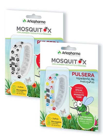 Mosquitox Pulsera Antimosquitos, contiene pastillas elaboradas con ingredientes de origen vegetal con eficacia repelente demostrada (extracto de eucalipto y acetite de lavandín).