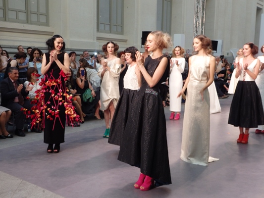 | Fely Campos, en el centro, recibe el aplauso de las modelos y del público. |