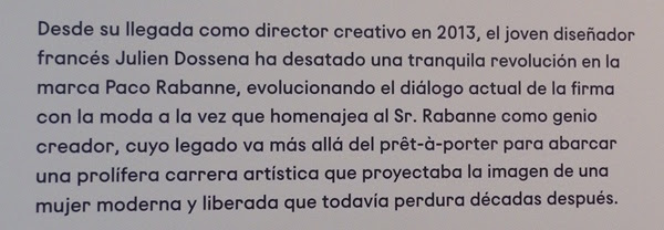 Y también una iniciativa única y pionera, dado que es la primera gran exposición que se le dedica en Madrid a quien fue considerado, junto a Cristóbal Balenciaga, el gran maestro de la moda española. Con una dualidad muy interesante, dado que incluye veinticinco piezas míticas y diez fotografías icónicas que han establecido un diálogo entre dos generaciones, dos formas de entender la modernidad: la del fundador de la marca, Paco Rabanne (Guipúzcoa, 1934) y la de su actual director artístico, Julien Dossena (Bretaña, 1982).