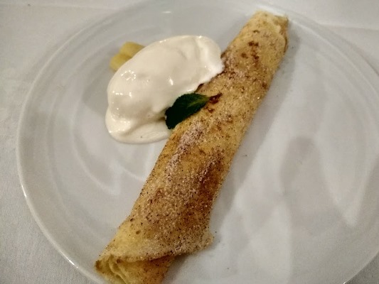 -Filloas rellenas de crema de manzana asada y Piononos como petit four.