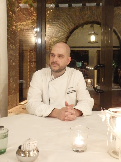 | Conversando con el chef Diego Huete, que nos contaba algunas de las recomendaciones del chef Mario Sandoval, a la hora de confeccionar los platos, a los postres. |