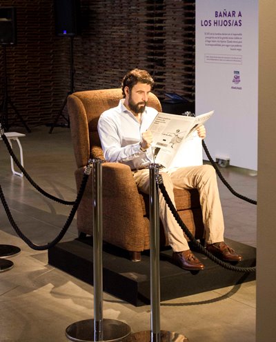 Con el objetivo de seguir fomentando la corresponsabilidad, surge la propuesta de llevar EL HOMBRE SENTADO EN EL SOFÁ al Museo Arqueológico Nacional. Él será el protagonista de una exposición abierta al público el 14 de noviembre en Matadero Madrid. Una pieza escultórica hiperrealista que representa el arquetipo que no participa en el reparto de las tareas del hogar, un hombre disfrutando de la tranquilidad de su casa, mientras lee el periódico sentado y descansando, sin ser consciente de lo que provoca su falta de contribución al hogar. Todo se presenta en una exhibición centrada en la corresponsabilidad en base a los datos extraídos del estudio Somos Equipo, en la que es una colaboración entre Kaiku Sin Lactosa y la Asociación Yo No Renuncio con el objetivo de dar luz al camino que actualmente se está dando en términos de reparto igualitario de responsabilidades familiares y del hogar.