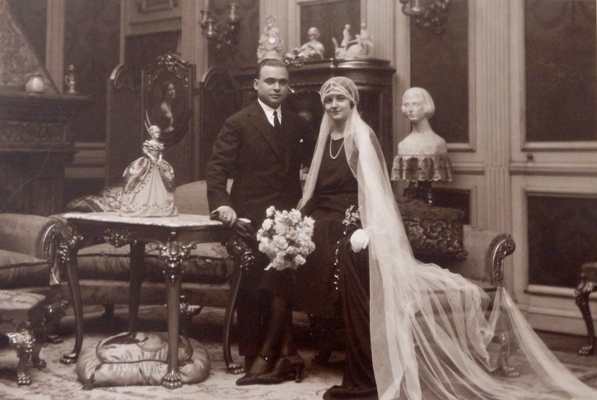 María Ginés Belmonte se casó muy jovencita, con sólo 19 años, en Madrid, no sabemos en qué iglesia, con Agustín Rubio Velasco, que posiblemente tendría 4 o 5 años más que la novia. Estaba guapísima el día de su boda, va vestida de negro, con un traje a media pierna y un largo velo blanco, sujeto con un espectacular tocado. El contraste del blanco del velo y el negro del traje de novia hace todavía más especial esta fotografía.
