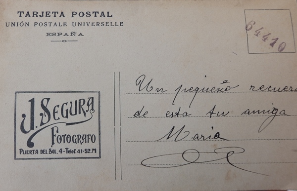 María Ginés, de jovencita, con 18 o 19 años, en una fotografía/postal. Abajo la dedicatoria que había hecho María para una amiga. Estas fotografías las habíamos publicado ya en Adoronews.com, en la boda de su hijo Agustín. Puedes recordar dicha boda, la de su hijo aquí: 1959-06-30: MARÍA CINTA OLARTE CORSSI, PARROQUIA DE SAN JERÓNIMO EL REAL, MADRID