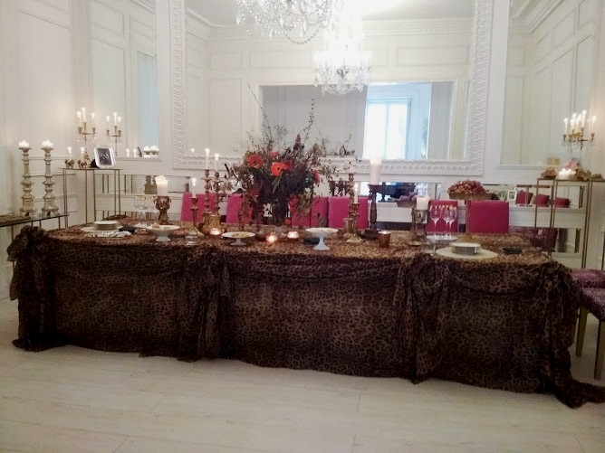 | Elegante y exquisita la mesa en la que ha cuidado, hasta el último detalle. El tejido, un animal print, rompedor, a juego incluso con el de la tapicería de las sillas. candelabros, velas, un gran jarrón central. Realmente impresionante. |