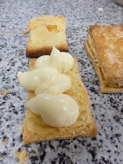 Mi hojaldre relleno de crema, al lado el de nata ya cerrado. |