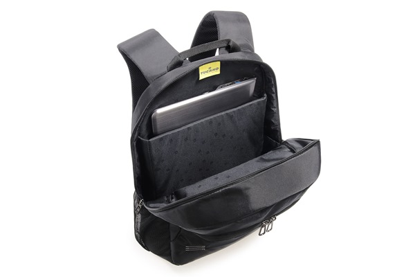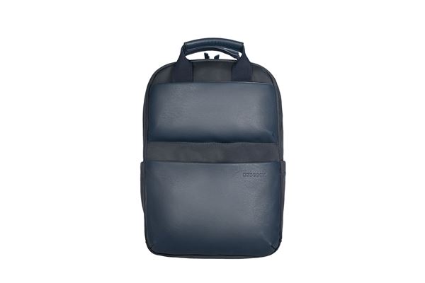 Mochila técnica con detalle en cuero ecológico. Perfecta para portátiles de hasta 14″ y tabletas, con compartimento doble con sistema anti-shock
