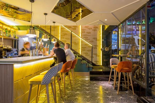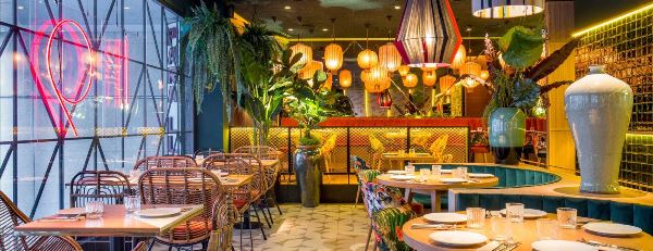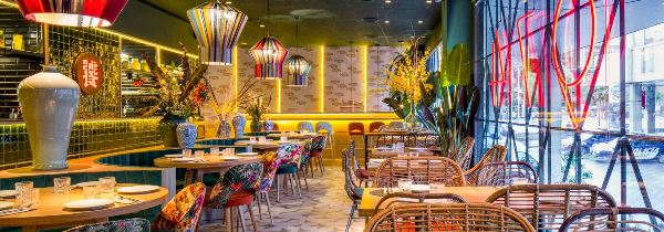 La protagonista de la planta baja es la brillante barra que recibe al visitante, desde la cual se da servicio también a la terraza, por cierto muy animada en esta temporada estival. En la planta superior encontramos paredes empapeladas de distintos colores; grandes lámparas tipo farolillo de originales pantallas de hilo; rincones rodeados de plantas que favorecen la intimidad y una amplia cocina vista desde la que los chefs muestran a los comensales el arte de las recetas de la cocina china. Lo que le da un encanto añadido.