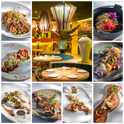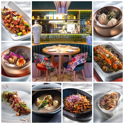 En el segundo collage: Arroz de ayer con anacardos, pollo y gambas; Auténtico pollo al limón hecho al carbón; Brocheta de pollo; Cangrejo estilo tradicional; Gambas con edamame y hojas de té; Pato laqueado con crema de naranja; Langostinos crujientes con salsa del chef marinada a base de licores chinos; Lubina con mejillón y chile de Sichuan.