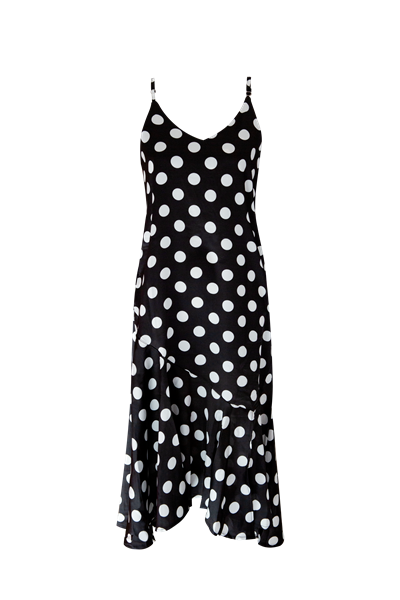 | Vestido negro con lunares grandes en blanco, muy favorecedor. De tirantes finos y con un volante asimétrico. PVP: 57,00 €. Disponible con el fondo blanco y el lunar en negro. |