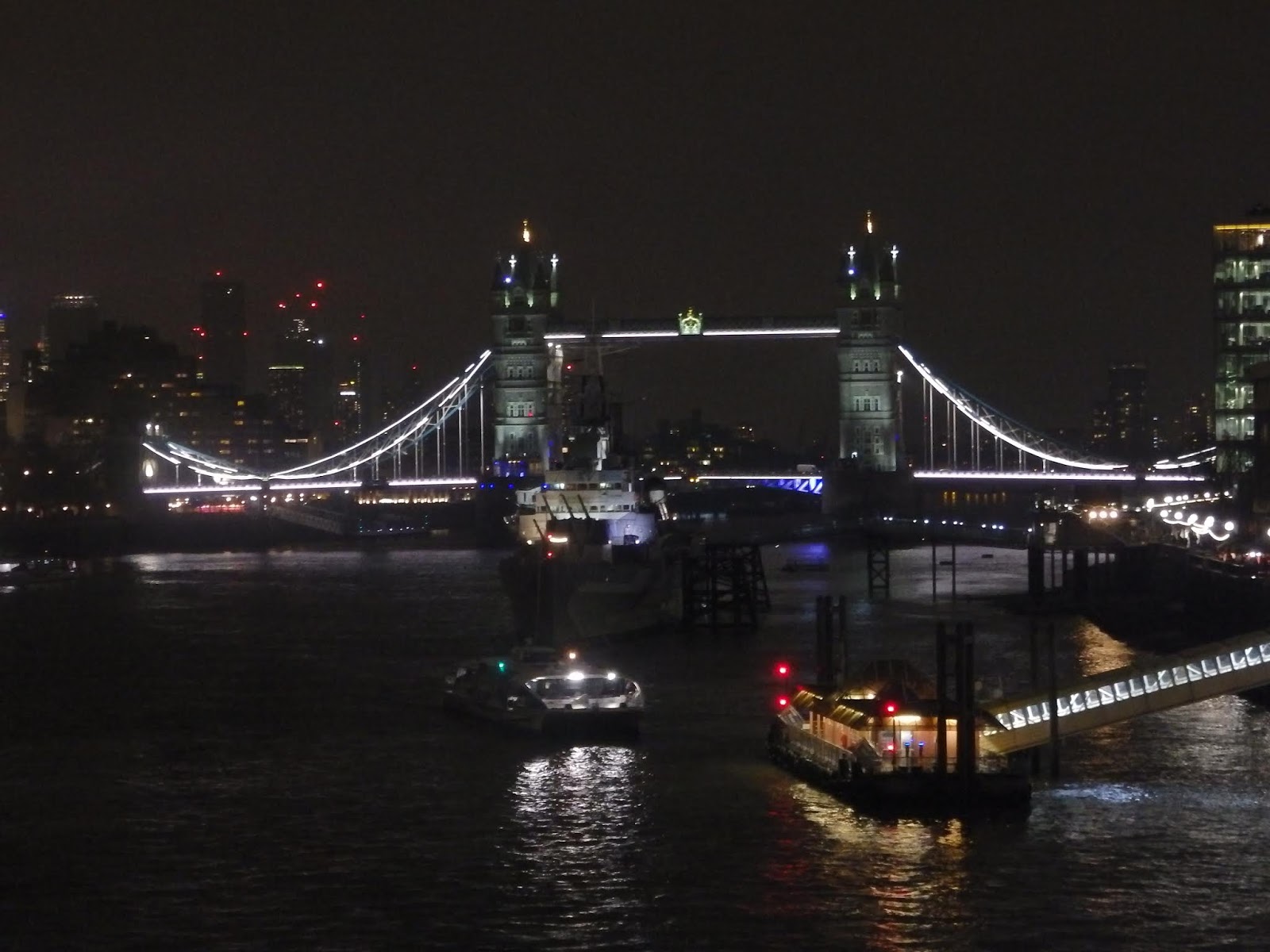 Después contemplamos el imponente Puente de la Torre de Londres, de una belleza singular. Iluminado de noche es bellísimo… con colores en turquesa. Atravesamos el puente… y recorrimos la otra orilla hasta el siguiente puente. En el Támesis hay un gran barco de la II Guerra Mundial… El HMS Belfast, que también se puede visitar.