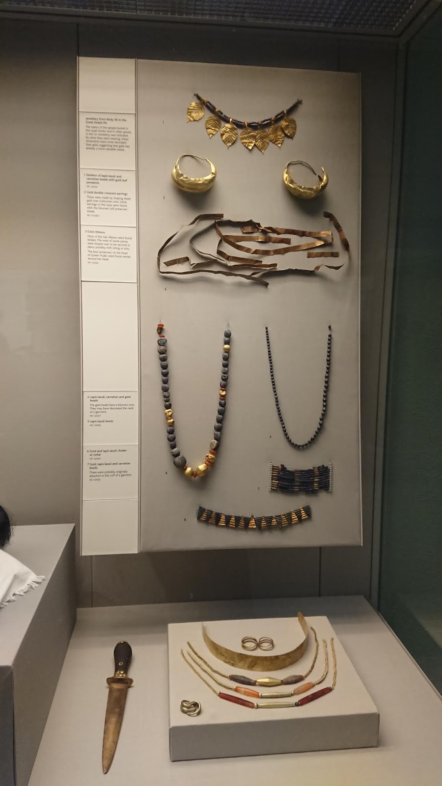 Hay una reconstrucción, con un tocado espectacular, que podemos ver en la realidad aplastado… hallado en el Gran pozo de la muerte de Ur, en lo que pudo ser un sacrificio humano masivo en la antigua Mesopotamia. Se llamó así por el gran número de cuerpos encontrados en él (El gran pozo…). Todos ricamente vestidos y dispuestos en filas. Se piensa que fueron sacrificados para acompañar a su amo /amante al más allá. No se sabe si de forma voluntaria o involuntaria. La excavación la realizó Charles Charlesardard Wooley de 1922 a 1934. Son tumbas y patios conectados a un pozo, junto a la tumba de un individuo principal e importante.