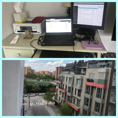 | Elena Z. Madrid. Matemática. «Mi puesto de trabajo, teletrabajando. Y las vistas al otro lado de mi calle, al fondo el estadio que suele estar siempre llenísimo de gente.» |