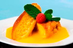 - Servir las torrijas de sobao sobre el coulis de melocotón.