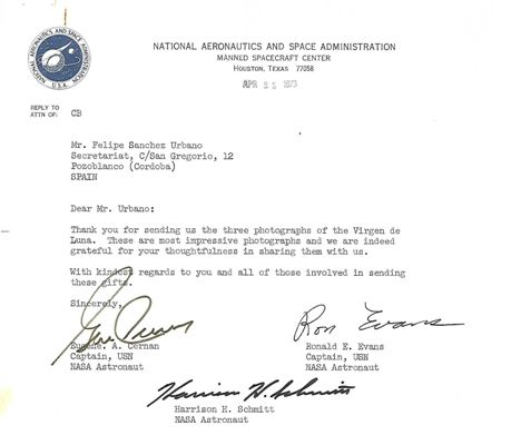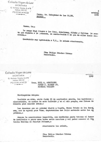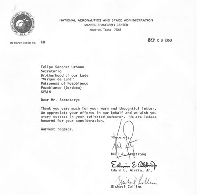 Por eso, Felipe Sánchez Urbano, en representación de la Junta Directiva de la Cofradía, redactó en 1969, y envió a través de la Embajada de los Estados Unidos en España, mecanografiada, una propuesta única y entrañable, como fue la de convertir a la Patrona de Pozoblanco -también hubo un intento de iniciar los trámites reglamentarios- para que fuese también la protectora de los astronautas del Apolo XI (documento adjunto). La propuesta transmitía la energía y el apoyo de todo un pueblo, a la gran aventura que estaban por emprender en beneficio de la Humanidad. Una vez conseguida la hazaña, en septiembre de 1969, la NASA, con la elegancia por cuidar los detalles de su imagen en el mundo como parte de la personalidad e idiosincrasia de la institución, envió como agradecimiento un documento firmado con todos los componentes de la tripulación del Apollo XI (imagen adjunta).