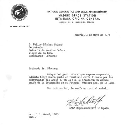 Y también de nuestra propia historia. Os lo contamos ahora, para que podáis opinar. A nosotros nos ha sorprendido y mucho. El tema central es la conexión de la Virgen de la Luna y el programa Apolo de la Nasa. ¿Es o no es interesante? A finales de los años sesenta se inició una relación epistolar entre la Cofradía de la que es patrona de Pozoblanco (Córdoba) y Villanueva de Córdoba, la Virgen de la Luna, y el programa Apolo de la NASA, que se mantuvo en el tiempo. La NASA envió un agradecimiento firmado por Aldrin, Armstrong y Collins, y también confirmó la recepción, por parte de la tripulación de Apolo XVII, de una estampilla de la Virgen. En 2021, toda esta historia ha pasado a formar parte de la Historia Oficial de la NASA