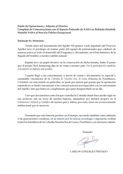 Por su parte, Anthony Carro, representante de NASA en España, afirma que “España desempeñó un papel crucial en el Programa Apolo a través de las estaciones de la NASA en Maspalomas, Fresnedillas y Robledo de Chavela. La primera comunicación desde la Luna durante la misión Apolo 11 se recibió en la estación de Fresnedillas. Esa cooperación de España con la NASA data ya del principio de los años 60, con anterioridad al programa Apolo, y continúa hasta nuestros días. El departamento de Historia de la NASA subrayó recientemente esa cooperación y, en particular, mencionó las cartas intercambiadas por Felipe Sánchez Urbano, de la Cofradía de Nuestra Señora de Luna, con los astronautas Armstrong, Aldrin y Collins del Apolo 11. La NASA agradece esta estrecha cooperación con España en la exploración e investigación del espacio para beneficio de la Humanidad”.