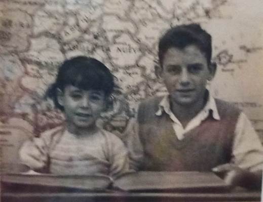 | Su hijo y su hija en una fotografía muy típica de las escuelas, con el mapa de España detrás. |