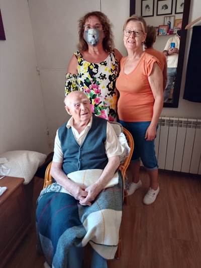 En la fotografía superior, Hilario el 9 de septiembre de 2020. A la derecha poso para el recuerdo con Hilario e Isabel, su hija, ese día.