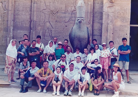 Foto de grupo ante la estatua de Horus, el guía egipicio está justo delante de nosotros. Había estudiado y vivido unos años en España.