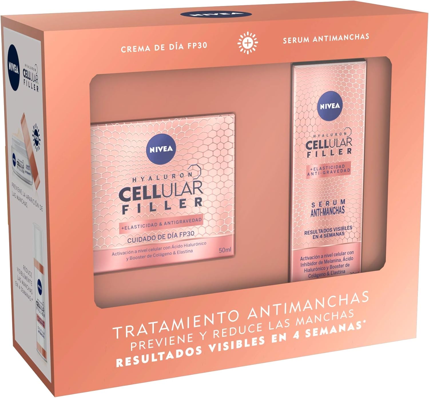 Nivea Pack Hyaluron Cellular Filler Tratamiento Antimanchas y Elasticidad, set de regalo con crema antiarrugas con FP30 (1 x 50 ml) y sérum antimanchas (1 x 30 ml). Precio: 21,67 €
