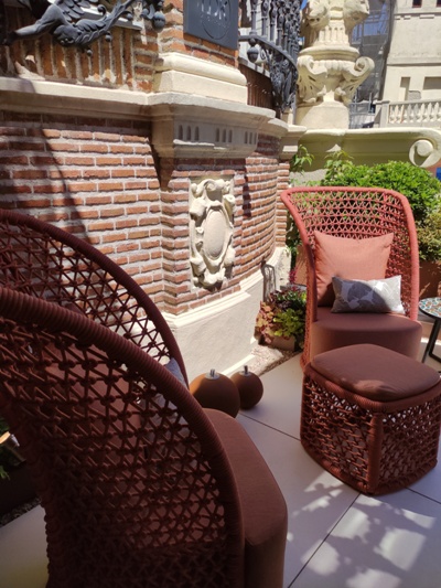 Un espacio funcional donde aluminio, piedra y plantas son protagonistas. Bajo el cielo madrileño, rodeados de bonito ladrillo neomudejar del edificio, piedra caliza, forja y observados por faunos, grifos o frutas. El toque natural también lo pone la plantación arbórea, arbustiva y herbácea, con floración, olor y texturas.