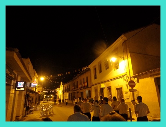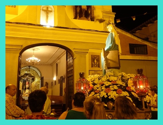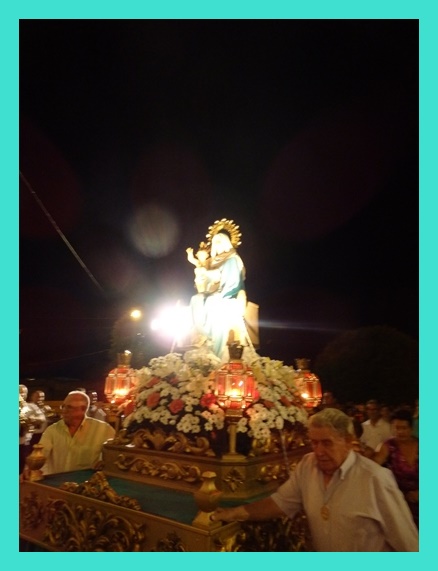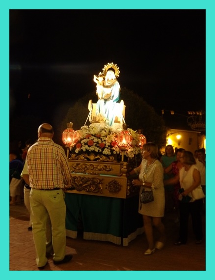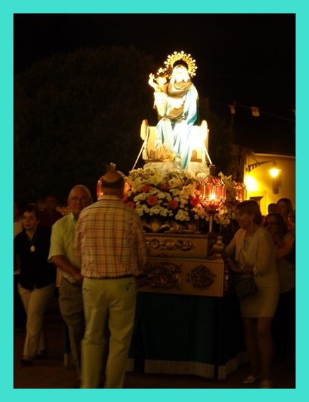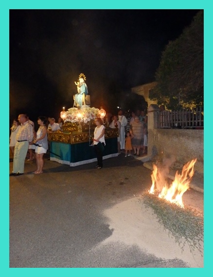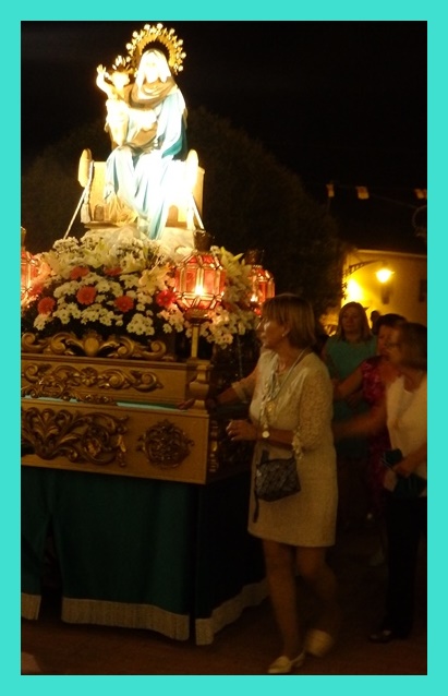 En ocasiones en la explanada de la iglesia se ha puesto también un castillo de fuegos artificiales. La gente del pueblo acompaña a la Virgen por el recorrido por el pueblo, muchos empujan la carroza, se van cambiando, poco a poco. Dos largas cintas también dan la posibilidad de acompañar a María en su trayecto. Cada una de las dos cintas azules, como el manto de la Virgen, pasan de mano en mano. Finalizada esta procesión, la del sábado, la Virgen regresa a la iglesia parroquial de Santa María Magdalena. Ya dentro todos juntos le cantamos la Salve. En la procesión del domingo por la tarde, a plena luz del día, la historia se repite y el final es el mismo. La Salve a María: