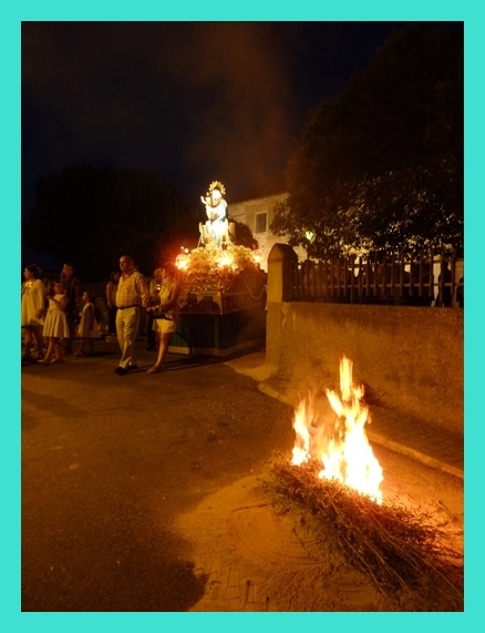 ¡Qué preciosa es y qué especial! La procesión del sábado, llamada Procesión de las Lumbres, algunos prefieren decir Procesión de las Hogueras, pero los choceros de verdad la llamamos de Las Lumbres, es la más singular del pueblo, porque alumbra su recorrido con hogueras… lo que nos hace pensar que la costumbre puede ser ancestral. Al incluir la magia del fuego, hace que el momento religioso sea más espectacular. En puntos determinados del recorrido se montan hogueras con leña de olivas y viñas, con sarmientos y a veces incluso algún trasto viejo o alguna ropa. En los últimos tiempos lo que se quema suele ser de origen vegetal casi exclusivamente. Tal vez los primeros impulsores de esta costumbre quisieron darle un sentido de renovación, de quemar todo lo malo, pasado el verano, para emprender el otoño limpios y nuevos. Puede ser que el sentido incluyera parte del que impulsa también las hogueras de San Juan, en nuestras playas… O tal vez podría deberse a que las primeras procesiones transcurrieran cuando ni siquiera existía luz eléctrica. Y después se haya mantenido la tradición. Muy curioso. La presidenta de la Cofradía es también de esta misma opinión: «Las lumbres se encendían para guiar la procesión, al no haber alumbrado público.»