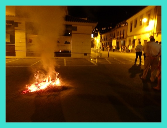 La primera lumbre se enciende, justo al salir la Virgen de la iglesia. |