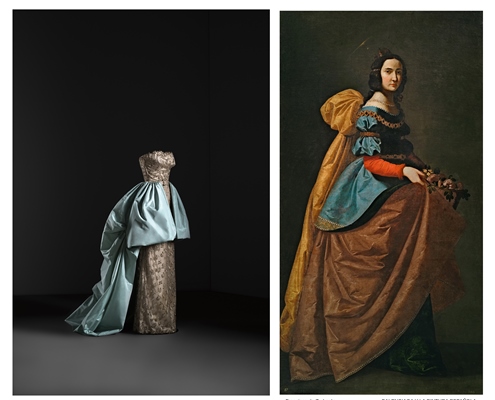 Imágenes de izquierda a derecha: Conjunto de noche de vestido y sobrefalda, hacia 1951. Museo del Traje/Zurbarán. Santa Isabel de Portugal, hacia 1635. Museo Nacional del Prado / El Greco.